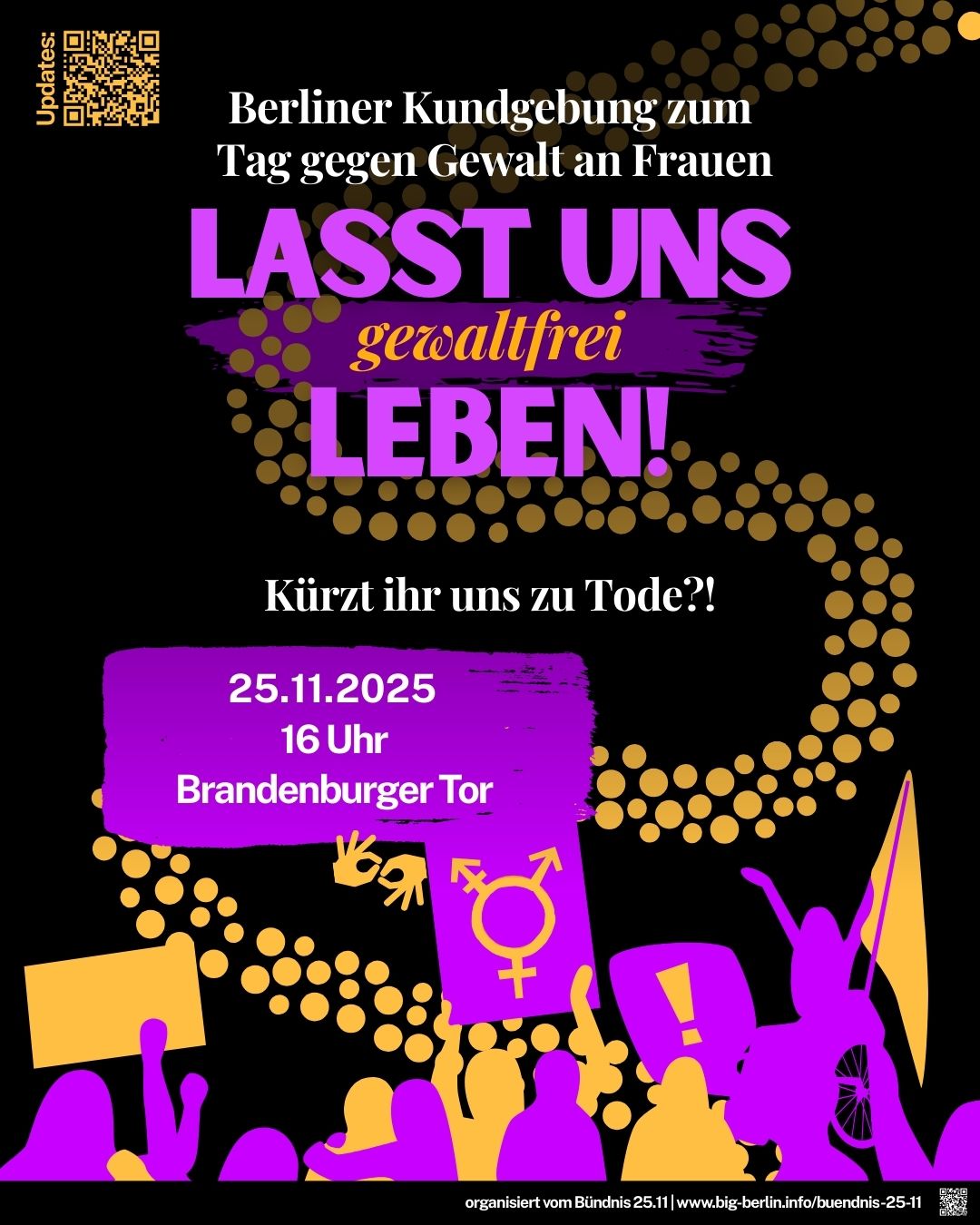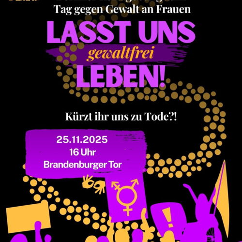 Am 25. November 2025, dem Internationalen Tag gegen Gewalt an Frauen, findet in Berlin eine große Kundgebung am Brandenburger Tor um 16 Uhr statt.